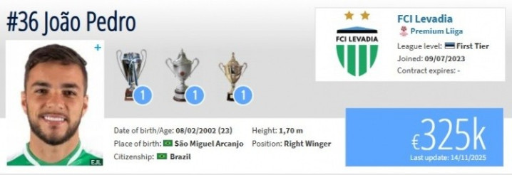 继续看这个球员,身价32.5万欧元,巴拉纳竞技出身,去过塞浦路斯帕福斯,最近两年在爱沙尼亚的塔林利瓦迪亚,连续两年进球+助攻15+,踢过欧冠和欧协杯资格赛。